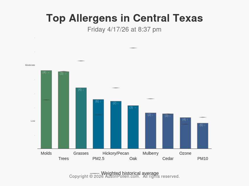 Top Allergens in Central Texas Friday 4/17/26 at 8:37 pm More Information: Molds Grasses PM2.5 (fine particulate matter) Hickory/Pecan Oak |
