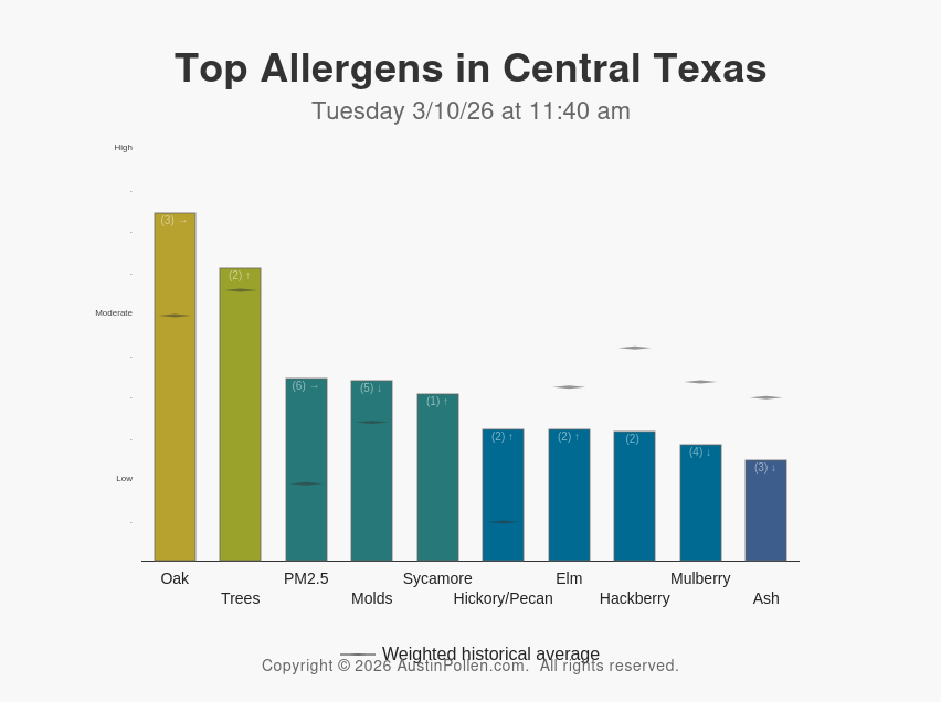 Top Allergens in Central Texas Tuesday 3/10/26 at 10:40 am More Information: Oak PM2.5 (fine particulate matter) Molds Hickory/Pecan Elm |